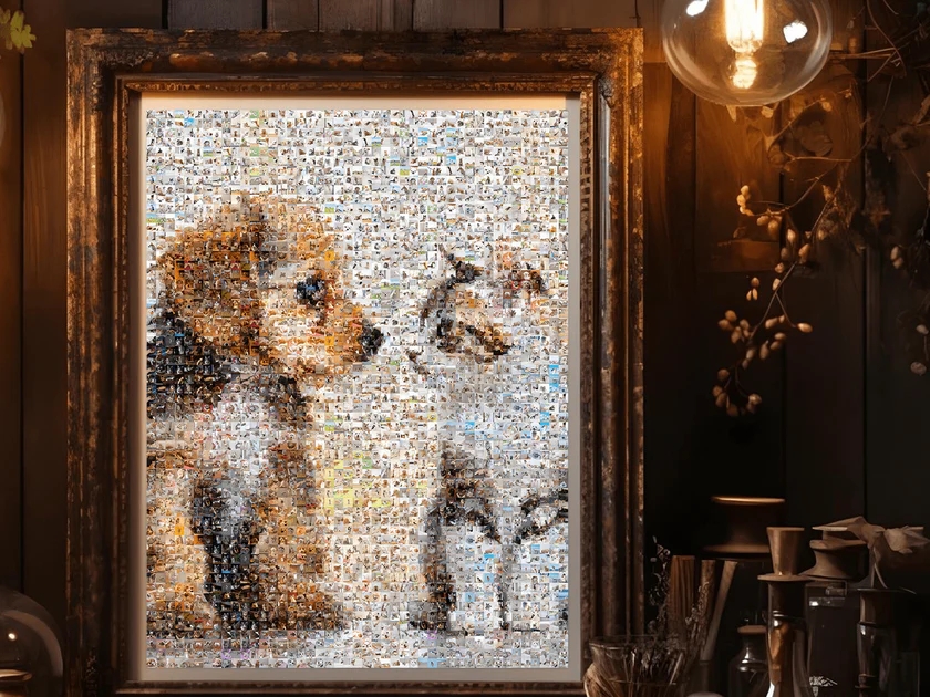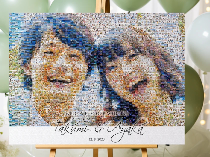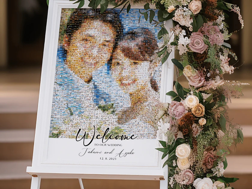 フォトモザイクアートは、数百枚から数千枚の小さな写真を組み合わせて、一枚の大きな画像を作り上げる芸術作品です。遠くから見ると一枚の写真に見え、近づくと思い出の写真一枚一枚が楽しめる、魅力的なアート作品となります。