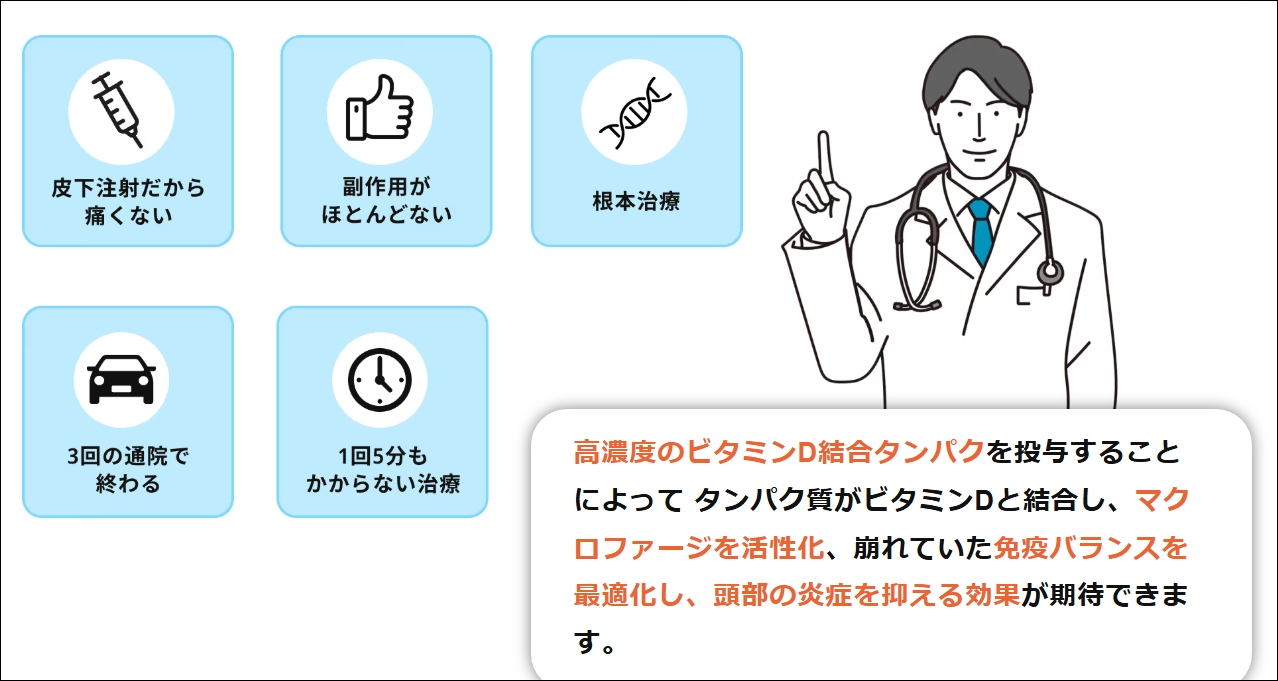 2. 治療成分: 高濃度ビタミンD結合タンパクを用い、免疫システムを活性化し、炎症を抑えることが特徴です。
