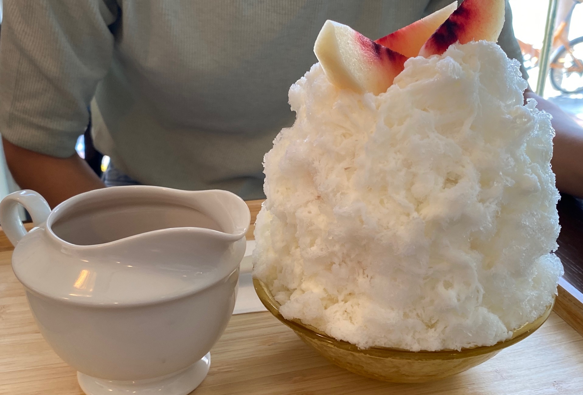 涼しげな店内と待ち時間の対策が工夫されています。定番のマンゴー×ミルクは果肉感とミルクのコクが特徴です。