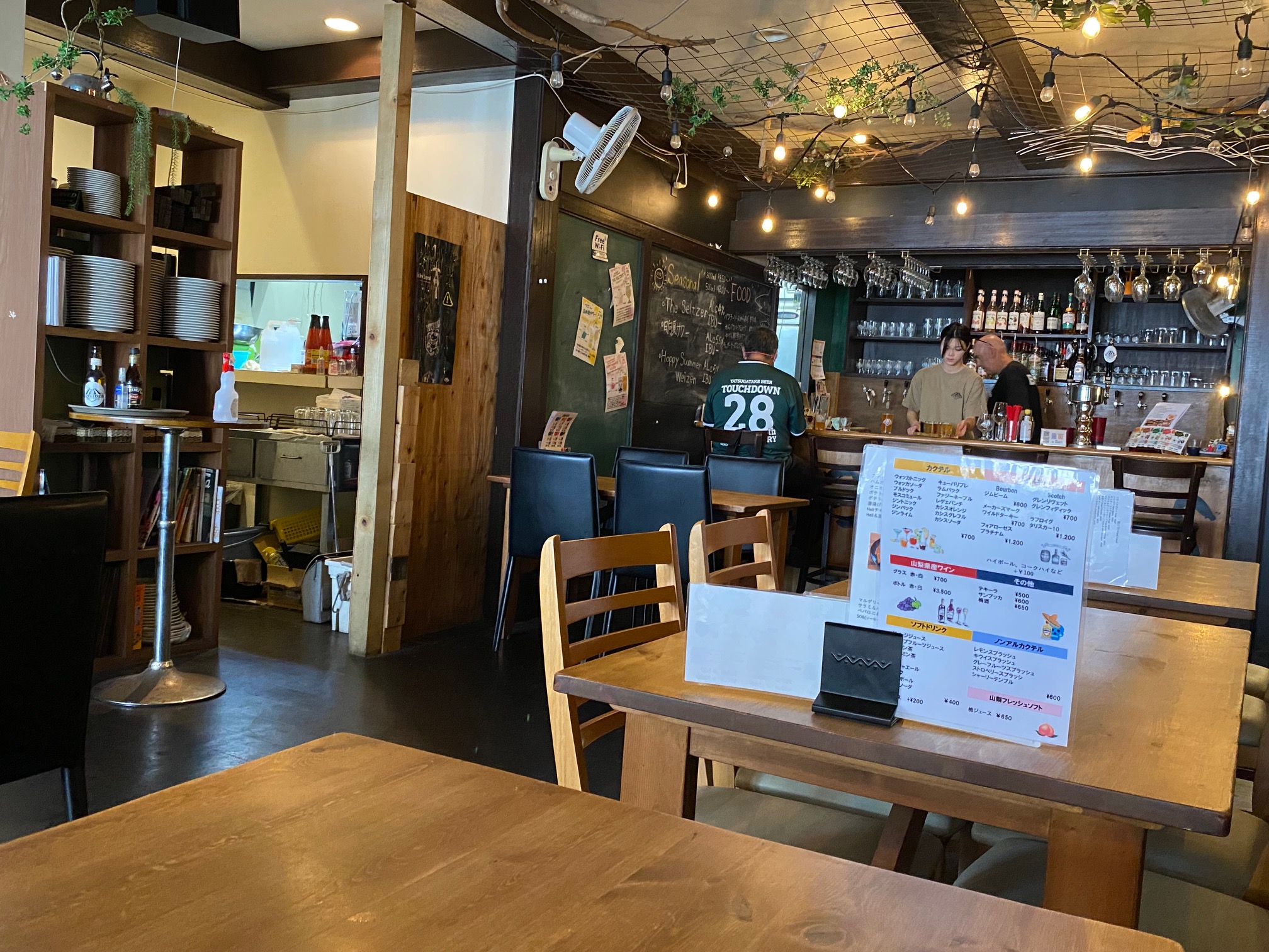 石和温泉街の近く、石和温泉駅から徒歩圏内。店内は木の温もりを感じるカジュアルな空間です。