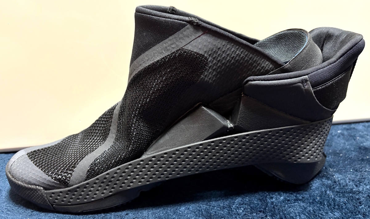 脱ぐときには、かかとの「キックスタンド」を逆の足で固定して足を引き上げると、ソールが「へ」の字に曲がった状態に戻り、ハンズフリーで脱ぐことができます。